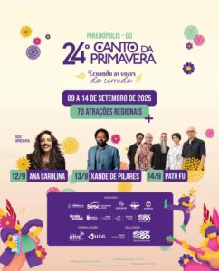 Em setembro, Pirenópolis será o palco da música brasileira com a 24ª edição da Mostra Nacional de Música Canto da Primavera. O evento, promovido pelo Governo de Goiás por meio da Secretaria de Estado da Cultura (Secult), acontece entre os dias 9 e 14 de setembro.