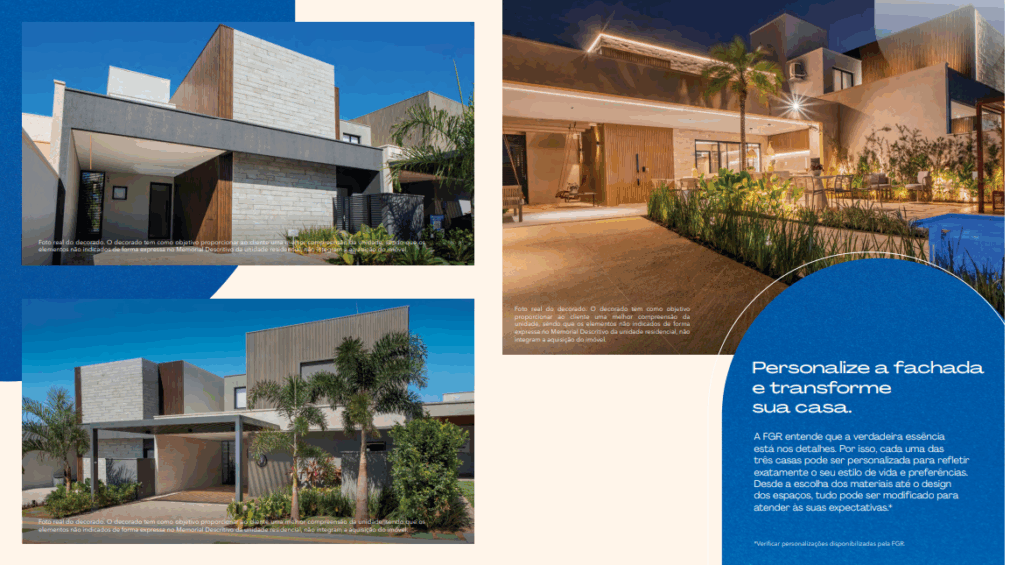 “As fachadas possuem até 45 variações. Os modelos serão implantados de forma que casas de fachadas iguais não fiquem próximas, o que trará um equilíbrio estético ao condomínio”, afirma Camila Alcântara, diretora comercial a FGR Incorporações