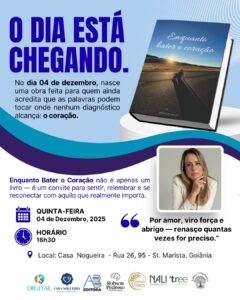 A socióloga, filósofa, publicitária e Dra. em Neurociência, a escritora Kênia Cardoso de Paula receberá convidados para o lançamento do Livro – ” Enquanto bater o coração – O que vem depois da metástase”, na tarde desta quinta-feira, 04 de Dezembro, na Casa Nogueira Boutique Portuguesa, no St. Marista, em Goiânia. O livro é escrito por uma paciente que vivência a metástase óssea. Uma verdadeira obra de autoajuda para pacientes e rede de apoio em doenças sem cura. A publicação tem projeto gráfico desenvolvido pela “K Digital”, agência goianiense especializada em marketing jurídico, que conferiu uma identidade visual contemporânea e alinhada à proposta temática. Será publicado pela AB Editora, com venda disponível na Amazon.Com.